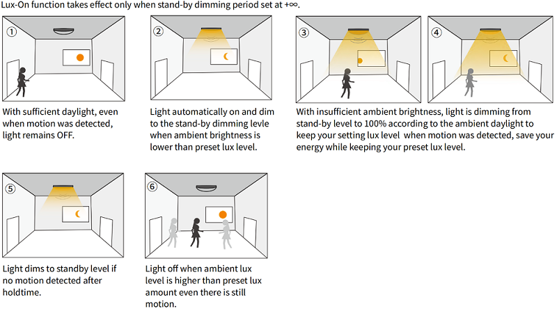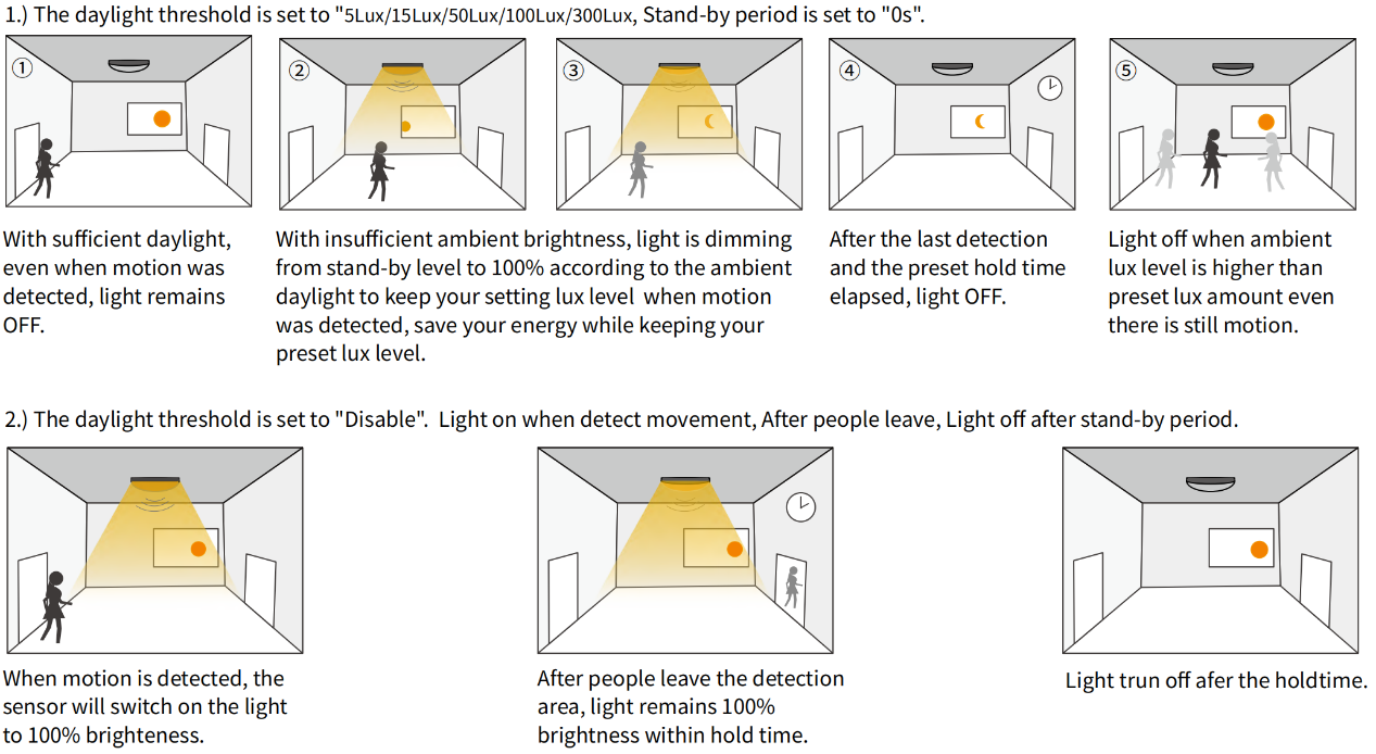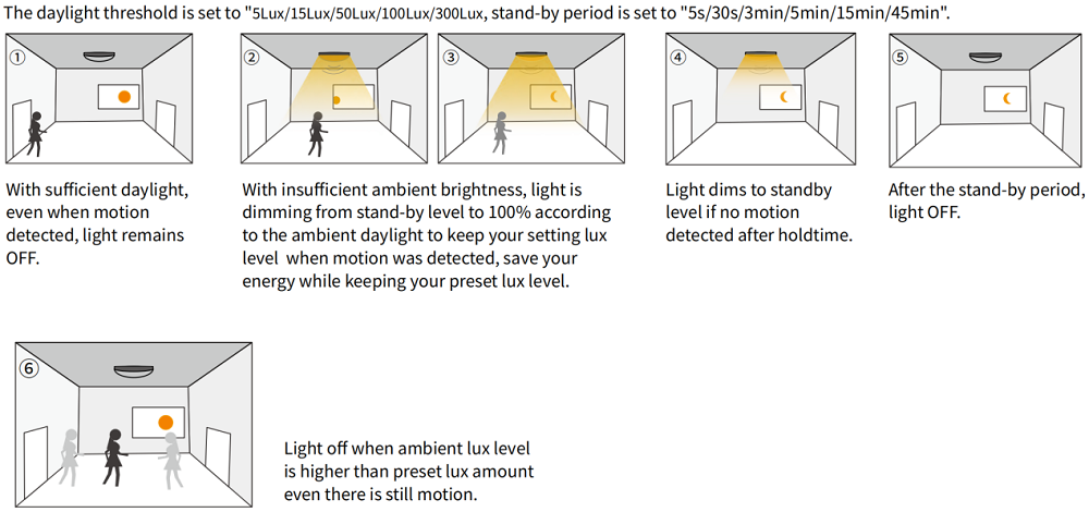 ड्युअल-पीडी तंत्रज्ञानामुळे, MC004-S02R सेन्सर नैसर्गिक प्रकाश आणि कृत्रिम LED लाइटमधील फरक सांगू शकतो. जेव्हा सभोवतालचा प्रकाश सेटिंग मूल्यापेक्षा कमी असेल, तेव्हा कोणतीही हालचाल आढळली नसतानाही सेन्सर तुमचे लाइट फिक्स्चर चालू करेल. जेव्हा सभोवतालचा प्रकाश सेटिंग व्हॅल्यूपर्यंत असतो, तेव्हा सेन्सर लाइट फिक्स्चर बंद करेल, तरीही हालचाल असेल.