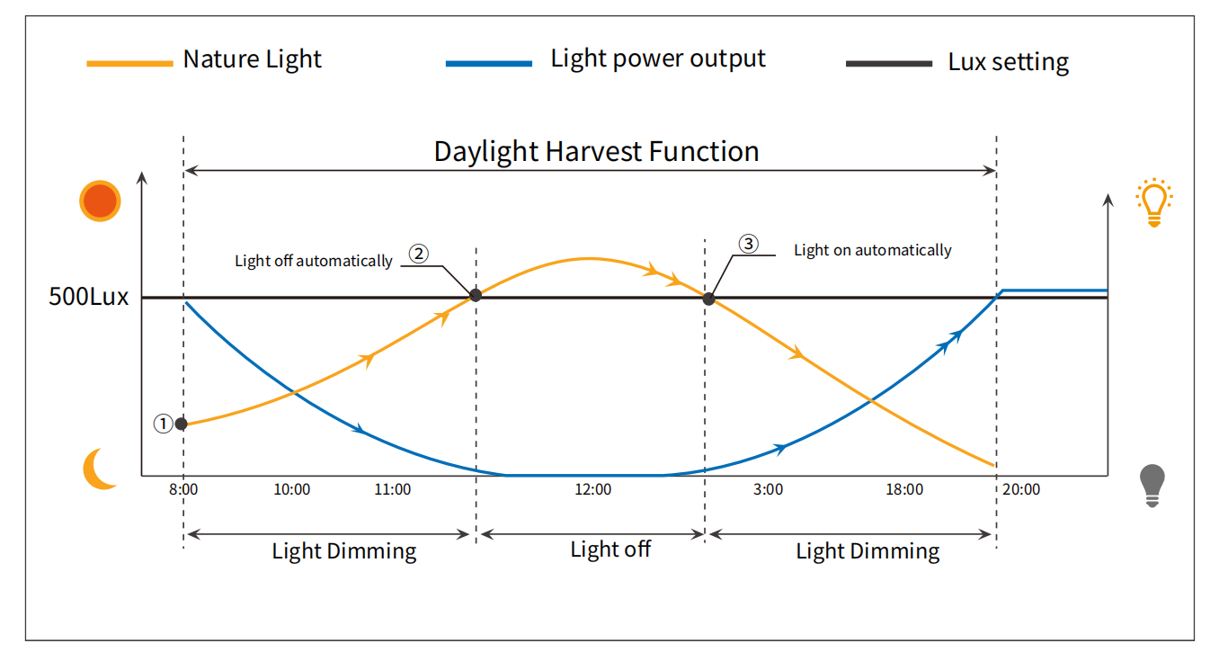 1. मोशन डिटेक्शन + डेलाइट हार्वेस्ट + लक्स ऑन/ऑफ फंक्शन