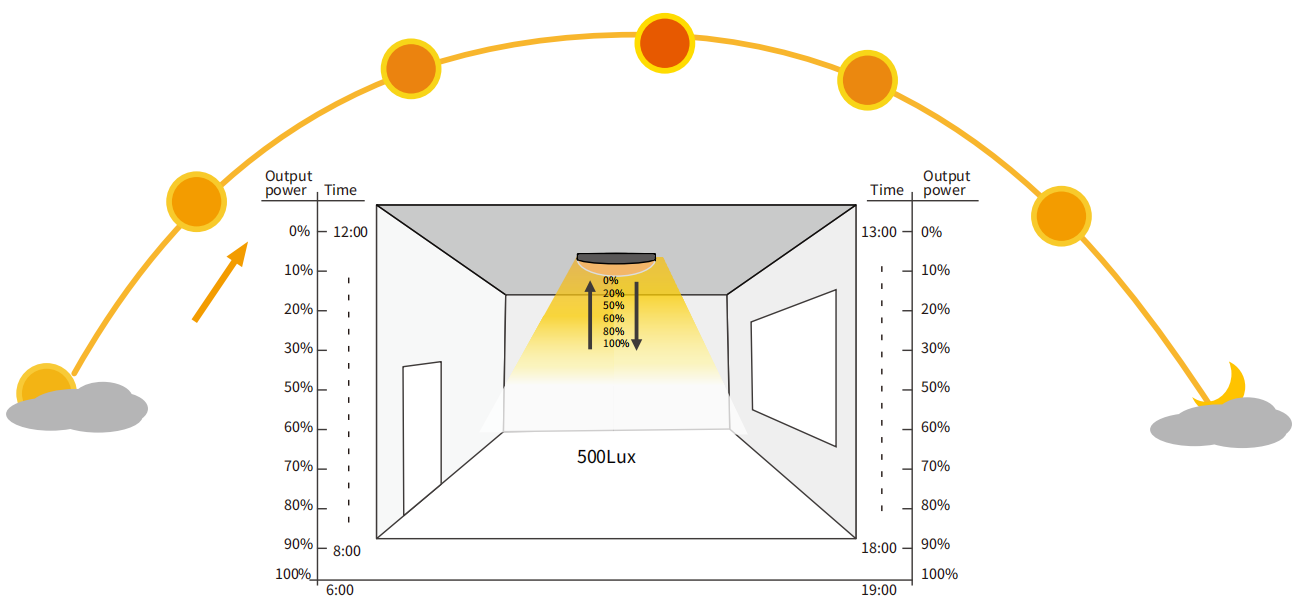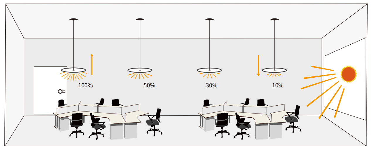 डेलाइट हार्वेस्टिंग - सभोवतालच्या प्रकाशाची तीव्रता आपोआप ओळखते आणि उर्जेचा वापर ऑप्टिमाइझ करण्यासाठी दिव्यांची चमक गतिशीलपणे समायोजित करते;