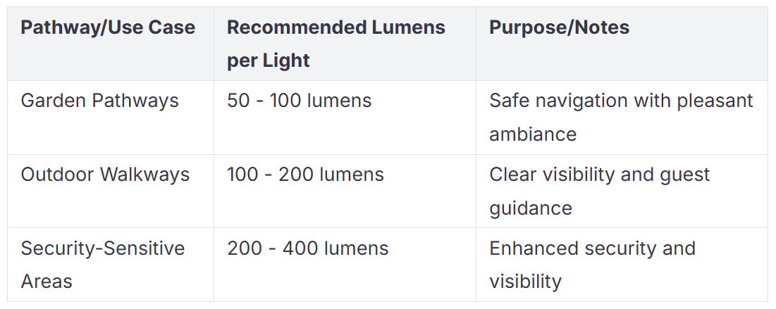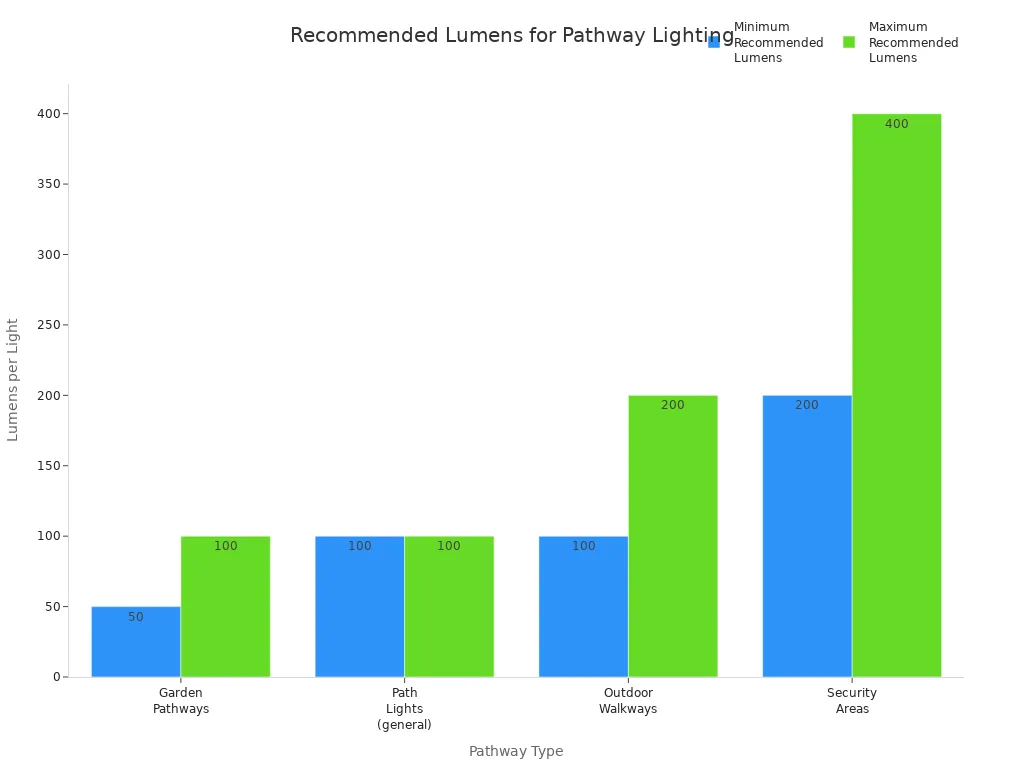 बाहेर सुरक्षित मार्ग असणे महत्त्वाचे आहे. पाथवे लाइटिंग लोकांना कुठे चालायचे हे पाहण्यात मदत करते. हे ट्रिप आणि फॉल्स देखील थांबवते. बागेच्या मार्गांसाठी, 50-100 लुमेनसह दिवे वापरा. चांगल्या प्रकाशासाठी पदपथांना 100-200 लुमेनची आवश्यकता असते. तुम्हाला अधिक सुरक्षितता हवी असल्यास, प्रति लाइट 200-400 लुमेन वापरा. समान प्रकाशासाठी बाहेरील एलईडी दिवे 6-8 फूट अंतरावर ठेवा. अरुंद मार्गांना जवळ जवळ दिवे लागतात. विस्तीर्ण मार्गांमध्ये दूरवर दिवे असू शकतात. जमिनीपासून सुमारे 14 इंच वर दिवे लावा. हे थेट बीम देते आणि मार्ग छान दिसते.