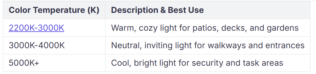 योग्य रंग तापमान निवडल्याने तुमची जागा कशी वाटते आणि कार्य करते ते बदलते. उबदार प्रकाश, 2200K ते 3000K पर्यंत, ठिकाणे आरामदायक आणि स्वागतार्ह वाटतात. हे पॅटिओस, डेक किंवा बागांसाठी वापरा जिथे तुम्हाला आराम करायचा आहे किंवा मित्रांसह मजा करायची आहे. तटस्थ पांढरा, 3000K आणि 4000K दरम्यान, स्पष्ट प्रकाश देतो जो खूप तेजस्वी नाही. हे पदपथ आणि प्रवेशद्वारांसाठी चांगले आहे जेणेकरून आपण आपल्या डोळ्यांना दुखापत न करता चांगले पाहू शकता. कूल पांढरा, 5000K वरील, अतिशय तेजस्वी आणि तीक्ष्ण आहे. हे सुरक्षितता प्रकाश किंवा स्पॉट्ससाठी वापरा जिथे तुम्हाला सर्वकाही स्पष्टपणे पाहण्याची आवश्यकता आहे.