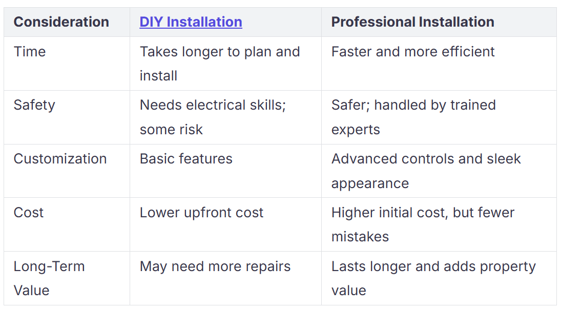 तुम्ही स्वतः बाहेरचे एलईडी दिवे लावू शकता किंवा मदत घेऊ शकता. ते स्वतः केल्याने पैशाची बचत होते आणि तुम्हाला डिझाइन निवडू देते. तुम्हाला विजेबद्दल काही गोष्टी माहित असणे आणि नियोजन करण्यासाठी वेळ काढणे आवश्यक आहे. आपण चुका केल्यास, ते असुरक्षित असू शकते किंवा दिवे खंडित होऊ शकते.