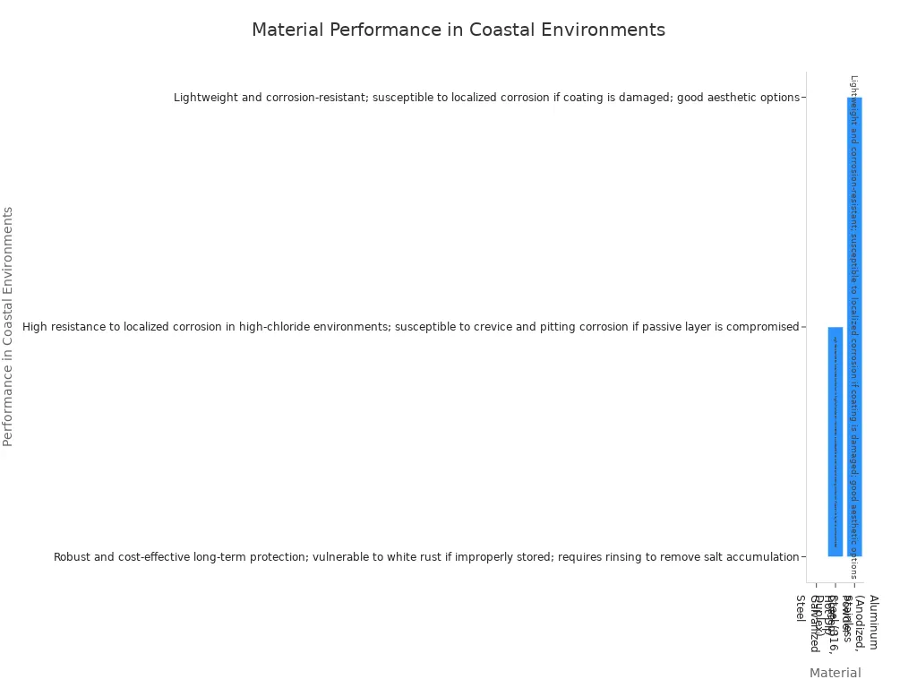 दिवे जास्त काळ टिकण्यासाठी उत्पादक पावडर कोट फिनिश आणि सीलबंद कव्हर वापरतात. ही वैशिष्ट्ये लीड वेदरप्रूफ लाइटिंगला वादळ, ओली हवा आणि मीठ स्प्रे टिकून राहण्यास मदत करतात. समुद्राजवळ विविध साहित्य कसे कार्य करतात ते तुम्ही खालील तक्त्यामध्ये पाहू शकता: