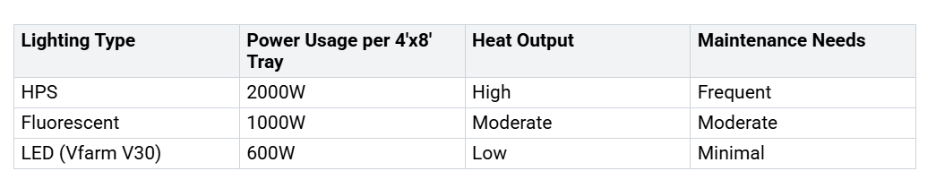 ऊर्जेचा खर्च तुमची इनडोअर गार्डन बनवू शकतो किंवा तोडू शकतो. एलईडी ग्रोथ दिवे त्यांच्या उल्लेखनीय कार्यक्षमतेसाठी आणि कमी उर्जेच्या वापरासाठी वेगळे आहेत. जेव्हा तुम्ही पारंपारिक उच्च-दाब सोडियम (HPS) किंवा फ्लोरोसेंट दिवे वरून LED वर स्विच करता, तेव्हा तुम्ही तुमचा ऊर्जा वापर कमी करू शकता५०-७०%. मोठ्या प्रमाणात उभ्या शेतीमध्ये, LEDs सुमारे वापरतात600W प्रति 4'x8' ट्रे, त्याच क्षेत्रासाठी HPS प्रणालींना 2000W पर्यंत आवश्यक असते. हे महत्त्वपूर्ण ऊर्जा बचत आणि कमी वीज बिलांमध्ये अनुवादित करते. LED देखील कमी उष्णता उत्सर्जित करतात, याचा अर्थ तुम्ही थंड होण्यासाठी कमी खर्च करता आणि तुमच्या पिकांच्या जवळ दिवे लावू शकता. Vfarm V30 चे इंटिग्रेटेड ड्रायव्हर आणि IP65 वॉटरप्रूफ डिझाइन मागणीच्या वातावरणात विश्वसनीय कामगिरी सुनिश्चित करते, पुढील देखभाल आणि ऑपरेशनल खर्च कमी करते.