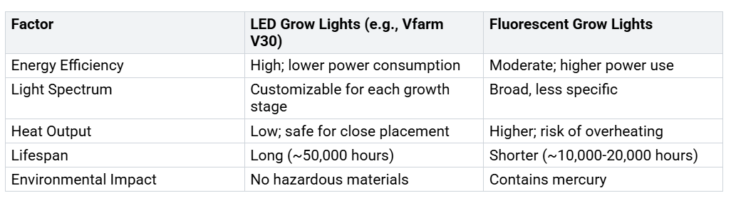 जेव्हा तुम्ही LED ग्रोथ लाइट्सची फ्लोरोसेंट पर्यायांशी तुलना करता, तेव्हा तुम्हाला स्पष्ट फायदे दिसतातऊर्जा कार्यक्षमता, वनस्पती आरोग्य, आणि देखभाल. FANXSTAR Vfarm V30 सारखे LEDs सानुकूल करण्यायोग्य प्रकाश स्पेक्ट्रम, दीर्घ आयुष्य आणि सुरक्षित ऑपरेशन ऑफर करतात. फ्लूरोसंट दिवे, जसे की T5 ट्यूब, अधिक ऊर्जा वापरतात, अधिक उष्णता निर्माण करतात आणि त्यांचे आयुष्य कमी असते. त्यात पारा सारखे घातक पदार्थ देखील असतात, ज्याची विशेष विल्हेवाट लागते.