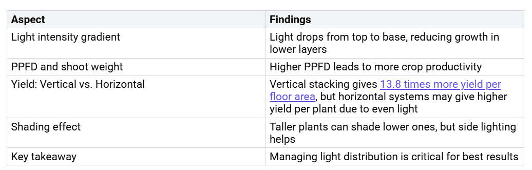 आपल्याला वैज्ञानिक अभ्यासातून स्पष्ट पुरावे दिसतात की उभ्या वाढणारे दिवे वनस्पतींच्या वाढीमध्ये आणि उत्पन्नामध्ये परिवर्तन करू शकतात. संशोधकांनी मापन केले आहे की प्रकाशाची तीव्रता वरपासून उभ्या स्तंभांच्या पायापर्यंत कशी बदलते. त्यांना आढळले की खालच्या थरांना अनेकदा कमी प्रकाश मिळतो, ज्यामुळे वाढ मर्यादित होऊ शकते. तथापि, जेव्हा तुम्ही साइड-ऑन किंवा इंटरलाइटिंग स्ट्रॅटेजी वापरता, तेव्हा तुम्ही सर्व स्तरांसाठी प्रकाश एक्सपोजर वाढवू शकता आणि उत्पादकता सुधारू शकता.