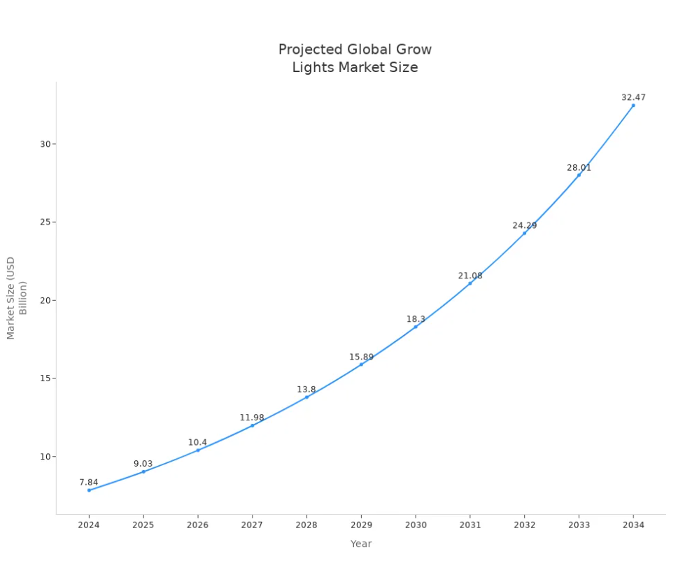 अचूक नियंत्रणासह स्मार्ट एलईडी प्रणाली वनस्पतींच्या वाढीस आणि उत्पादकतेला चालना देतात यावर तज्ञ सहमत आहेत. दया उपायांसाठी बाजारपेठ वेगाने विस्तारत आहे, खाली दर्शविल्याप्रमाणे: